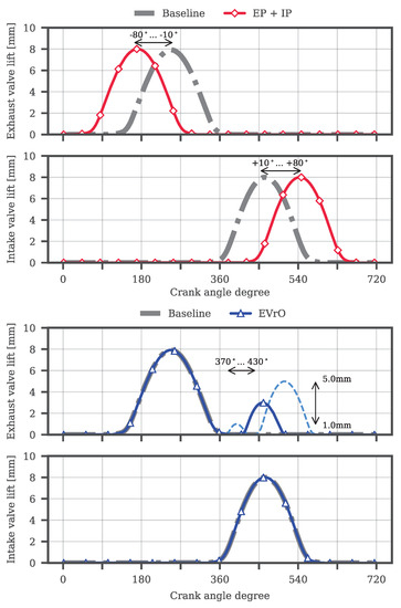 - Exhaust phasing and Intake phasing (EP + IP): the exhaust event and the intake event are shifted the same angle, respect to the baseline valve timings. The intake and exhaust valve lifts are represented by a red line with diamond markers in Figure 7. Two versions of this system have been modeled and simulated: one actuating over the cylinder valves and the other actuating only over one intake valve and one exhaust valve. The increase in the exhaust temperature is created, partially, due to the EEVO, since the exhaust blowdown of hot gases from the combustion into the exhaust ports increases the temperature downstream this point. Moreover, some amount of burnt gases are retained later during the intake stroke due to the early EVC, increasing the air-charge temperature at IVC. The late IVO avoids a hot backflow of these burnt gases into the intake manifold, and it compensates the pumping losses due to the compression of these gases with the following brief expansion between TDC and IVO. A parametric study has been done in steady-state conditions by modifying the advance/delay from 10° CA to 80° CA in 10° steps, as seen in Figure 7.