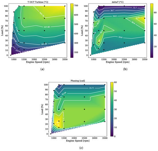 An “EP + IP” control (intake delay and exhaust advance) and an “EVrO” control (start, duration, and lift) were included in the ECU sub-model in order to carry out the transient simulations. This controllers read the current value of re-opening lift, start, etc., from a map like the one on Figure 8c, based on the current engine speed and torque. For each case defined in Table 3, a set of maps must be created. For instance, Figure 8a shows the gas temperature map at turbine outlet in Case 3. Figure 8b shows this same temperature as a difference between the baseline case. An increase of more than 50 °C can be reached up to 80% load at any engine speed. Finally, Figure 8c represents the angle phasing map in Case 3. It can be observed that a phasing of 40° CA is applied above idle to 70% load.