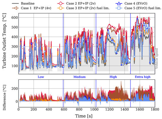 The main goal of this study is to achieve greater exhaust temperatures in order to increase the efficiency of the after-treatment devices during their heating phase. In Figure 9, the temperature at the turbine outlet section, intermediately preceding the catalyst, achieved by each case is presented. It can be observed that this temperature is higher than the baseline in the five cases throughout the whole WLTC. This temperature difference can be better observed in the lower subplot. At the low speed stage, both “EVrO” cases do not offer a remarkable difference in the temperature increment. Comparing the three “EP + IP” cases, Case 2 performs better during this low speed stage than Case 1, achieving instantaneous peak differences higher than 100 °C and an average difference at this stage of 67 °C. From the medium speed stage onwards, both “EVrO” cases perform better than Case 3. This means that, with the same limitation in fuel consumption, Case 5 is able to obtain more exhaust temperature than Case 3. Case 1, in which the intake and exhaust phasing is applied on the four valves, generally performs worse than the two valves case. The average temperature difference in Case 1 is 98 °C throughout the whole WLTC, in contrast to the 121 °C achieved by Case 2.