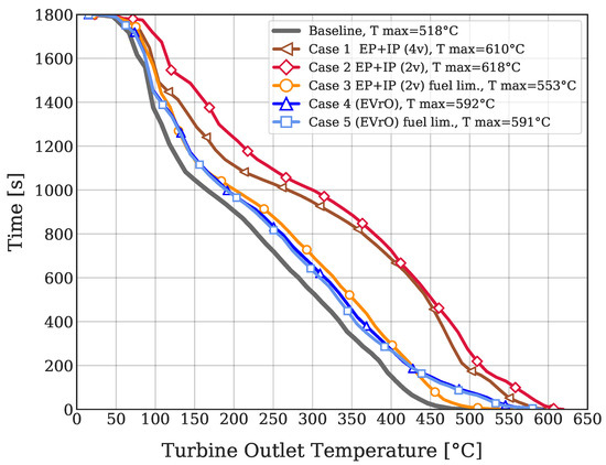 Figure 10 shows how much time the temperature at the turbine outlet section is above a certain value. The minimum temperature values (the initial ones) are shown at the top of the graph, since, for the total test time (1800 s), the temperature is above this minimum values. The maximum values are shown in the bottom of the graph because they are only achieved at one instant. Maximum values are also indicated in the legend. It can be observed that all the Cases allow for reaching higher temperatures than the baseline valve-train. Both “EVrO” Cases and Case 3 show a similar behavior for around 1600 s. Cases 4 and 5 achieve higher temperatures than Case 3 for 200 s, which correspond to the final high speed accelerations of the WLTC. Case 2 depicts the higher temperature of all cases and Case 1 performs in between of Cases 2 and 3. If vertical line is drawn between 200 °C and 250 °C, where the DOC conversion efficiency surpasses 50%, the temperature of the baseline case will be above this value for 800 s. In Cases 3–5, this time is extended up to 900–950 s. Case 2 is able to keep a temperature above this level for 1150 s.