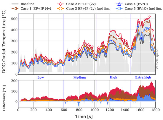 In addition to the DOC inlet temperature, it is also interesting to analyze how the different cases affect the gases temperature at DOC outlet section. A temperature increment at this point could be profitable for increasing the efficiency of a NOx adsorber, or to regenerate the Diesel particle filter. Figure 11 shows the gas temperature downstream the DOC, before entering the DPF. Similarly to Figure 9, “EP + IP” cases perform better than “EVrO” ones and Case 2 achieves the greatest increment in temperature. Its average increment throughout the test cycle is 80 °C, followed by case 1, with an average of 53 °C. It is also noticeable how Case 4 and Case 5 obtain less temperature than the baseline case at some moments, like the one near 800 s. At this time, the engine is accelerating from 1000 rpm to 1250 rpm at a low torque. According to the re-opening lift map that was obtained by the steady-state optimization, the relatively high lift value in this region of the map causes a torque fall down in transient operating conditions.