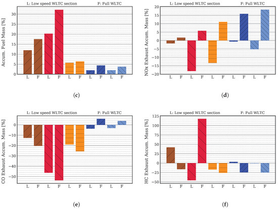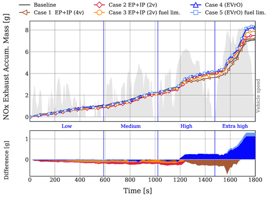 In terms of NOx formation, Figure 14 shows how there are no important differences until the high speed stage of the WLTC. During the fast accelerations at high engine speed, Cases 1 and 3 produce a higher amount of IGR than “EVrO” cases. Thus, reducing NOx formation at high engine speed. Cases 4 and 5, on the contrary, do not perform so well in terms of exhaust gases retention. This, plus the fact that the air loop controller closes the LP-EGR valve more than in the baseline case, leads to greater NOx formation, which can be observed better in the bottom subplot of Figure 14. The accumulated differences of NOx emissions are later described in relative terms in Figure 15d, which they are separated into emissions at the end of the low speed stage and emissions at the end of the full WLTC.