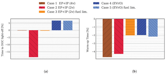 WLTC model results during the low speed stage and the whole cycle, engine start at 20 °C ambient temperature. Percentage variation compared to the baseline case. (a) Time to reach DOC light-off temperature; (b) Time to reach coolant thermostat threshold; (c) Accumulated fuel consumption; (d) Accumulated engine-out NOx emissions; (e) Accumulated CO emissions at DOC outlet; (f) Accumulated HC emissions at DOC outlet.