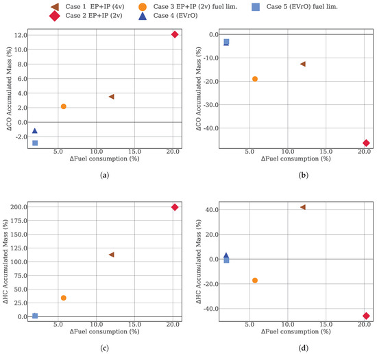 Fuel consumption variation (%) versus CO and HC accumulated mass variation (%) trade-offs during the low speed stage of the WLTC, taking the baseline case as the reference. (a) Fuel consumption (%) versus CO accumulated mass (%) upstream the DOC. (b) Fuel consumption (%) versus CO accumulated mass (%) downstream the DOC. (c) Fuel consumption (%) versus HC accumulated mass (%) upstream the DOC. (d) Fuel consumption (%) versus HC accumulated mass (%) downstream the DOC.