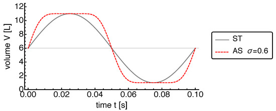 Comparison of the cylinder volume over time for the “standard harmonic motion” ST (solid line) and “adjustable sinusoidal motion” AS (dashed line) for with and . For the AS motion with , the maximum volume speed (e.g., around ) increases, while the piston speed around the volume extrema decreases.