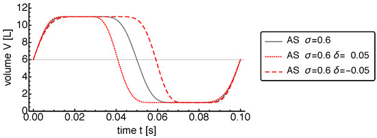 Plot of the cylinder volume over time for the “adjustable sinusoidal motion” AS for with and (solid line) in comparison to the AS motion with and (dashed line) and with and (dotted line). Within a period of motion, negative values of reduce the time the volume spends around its maximum and increase the time it spends around its minimum. Positive values lead to the opposite effect.