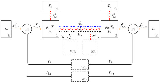 The endoreversible description just introduced enables us to build the model of the alpha-type Stirling engine as shown in Figure 3. Here, the subsystems shown as circles are the endoreversible engines T1 and T2 representing the mechanical transmission. They are the link between the cylinders of the Stirling engine (reservoirs 1 and 2) and the environment (reservoirs E) and convert the volume work flux of the piston stroke into power fluxes. The latter are collected in the work reservoir WT for net power from the volumetric process and in the work reservoir WF for frictional power loss of the mechanical transmission.