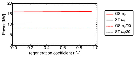 The power output is shown as a function of the regeneration coefficient r for the reference case in comparison with the low mass transfer case. For both, the power output is nearly unaffected by the extent of the regeneration independent of the used motion.