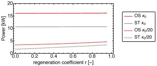 The power output is shown as a function of the regeneration coefficient r for the reference case in comparison with the low conductance case. While the power output for the reference case is nearly unaffected by the extent of the regeneration this is different for the low conductance case, which shows a declining power with declining regeneration.