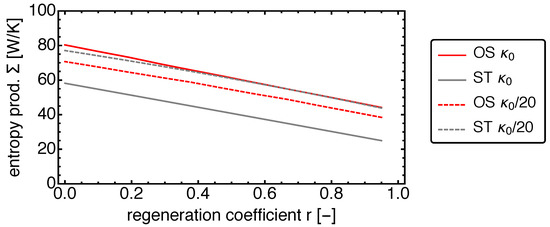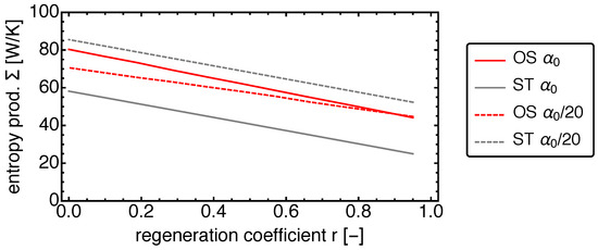 In Endoreversible Thermodynamics, the Stirling engine is seen as a collection of subsystems. While these are still reversible solely, the connections between them can be irreversible. The advantage of this description is that knowledge about equilibrium systems can be applied and entropy production only occurs through transfers between the subsystems. Initially the focus of Endoreversible Thermodynamics was on relatively simple heat engines and refrigerators [35,36,37,38], but its scope widened later to include applications related to for instance solar power [39,40,41,42] and chemical processes [15,43,44,45,46]. Also the performance of more complex systems [47,48,49,50,51,52] has been investigated and recent work widened the treatment to the thermodynamics of computing [53] and systems under temporal fluctuations [54] leading to generalizations of the well known Curzon–Ahlborn efficiency [55].