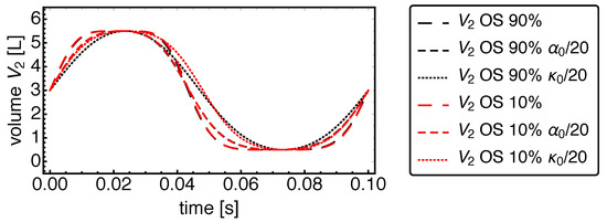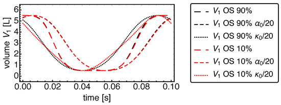 This parameter affects the symmetry of the shape of the volume vs. time curve within a period of motion. For , the dwell time of the piston at the volume maximum is reduced, while the dwell time around the volume minimum is increased. As Figure 2 shows, the slope of the volume curve is practically unchanged while varying , thus it has a much smaller influence on the piston speed than the parameter .