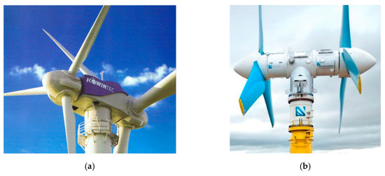 Dual rotor; (a) wind turbine of Kowintech Co. Ltd.; and (b) tidal turbine of SIMEC Atlantis Energy (formerly Atlantis Resources Corp.).