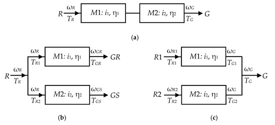 It is known that mechanical transmissions where power is transmitted in parallel, also known as split-power transmissions, have higher efficiency than transmissions formed with mechanisms connected in series [51]. The same applies to speed increasers used in wind, hydro and marine-current power generating systems that integrate two counter-rotating wind or water rotors and/or one counter-rotating electric generator. A 1-DOF transmission consisting of two 1-DOF mechanisms M1 and M2 is assumed, providing serial (Figure 2a) or in-parallel transmission (Figure 2b,c) of the mechanical power from one rotor (R) or from two counter-rotating rotors (R1 and R2) to a standard electric generator (G) with a fixed stator, or to a generator with counter-rotating rotor (GR) and moving stator (GS). Mechanisms M1 and M2 are characterized by their kinematic ratios i1 and i2, and efficiencies η1 and η2. Each shaft x has an angular velocity ωx and transmits a torque Tx (where x is either R, R1, R2, G, GR or GS).