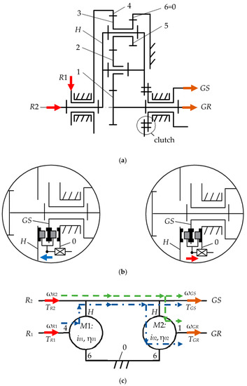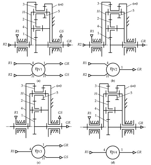 - Case C (Figure 2c): speed increaser with two inputs (R1 and R2) and one output (G).from where the efficiency of the transmission is calculated as:where kt is the input torque ratio: