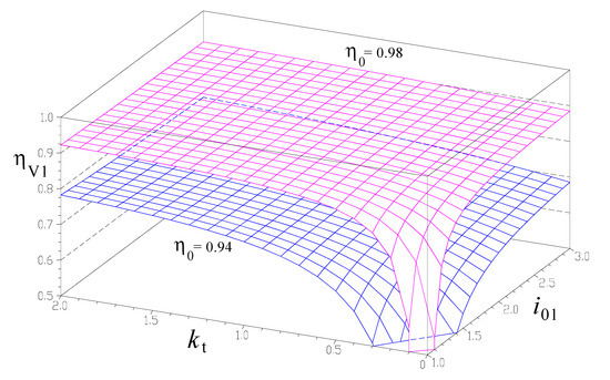 Four independent parameters, i.e., i01, i02, kt and η0 occur in the efficiency Equations (34)–(37) of the planetary speed increaser variants V1, V2, V3 and V4. The effects of these parameters upon overall efficiency and kinematic ratios of the respective speed increasers have been studied using bivariate plots as explained in [55,56] (see Figure 6, Figure 7, Figure 8, Figure 9 and Figure 10; note that in some of these plots the z-axis has been reversed for clarity). The value ranges of these four parameters have been considered as follows: the kinematic ratio of the speed increaser iaG = ωG/ωR1 ≥ 3, input torque ratio kt < 2 and efficiency of a typical pair of gears η0 > 0.94 [57].