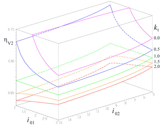 In case of variant V2 of gear increasers (which is the same as variant V1 but with a locked stator, i.e., ) Equation (35) indicates that the efficiency ηV2 of the increaser depends on all four parameters i01, i02, kt and η0. Assuming that each gear-pair of the transmission has the same efficiency η0 and equal to 0.965, according to the plot in Figure 7, ηV2 is influenced manly by the interior kinematic ratio i01 and by the torque ratio kt, and less by the interior ratio i02. As i02 increases and for i01 and kt assumed constant, a slight increase of ηV2 is observed. Likewise, efficiency ηV2 increases for kt < 1, and decreases slightly for kt > 1 as i01 increases. For kt = 1, efficiency ηV2 no longer depends on i01, which may be interesting when large kinematic amplification ratios iaG are desired. Same as for variant V1, an increase of the torque ratio kt is accompanied by an increase in efficiency ηV2. The increase of ηV2 with kt is more significant for small values of i01 than is for larger values of i01.