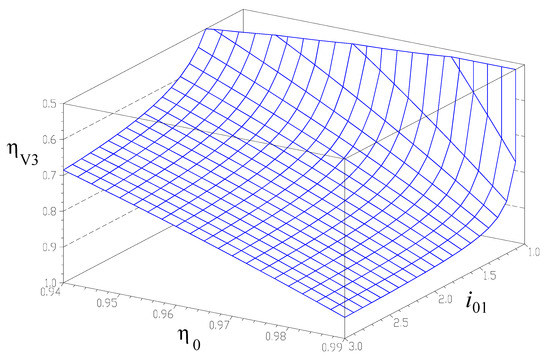 Efficiency of the 1-DOF speed increaser variant V3 (Figure 5c), as function of the interior kinematic ratio i01 and η0.