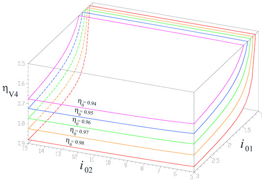 Efficiency of the 1-DOF speed increaser variant V4 (Figure 5d) as functions of the interior kinematic ratios i01 and i02, for various gear-pair efficiencies η0 = 0.94, 0.95, 0.96, 0.97 and 0.98.