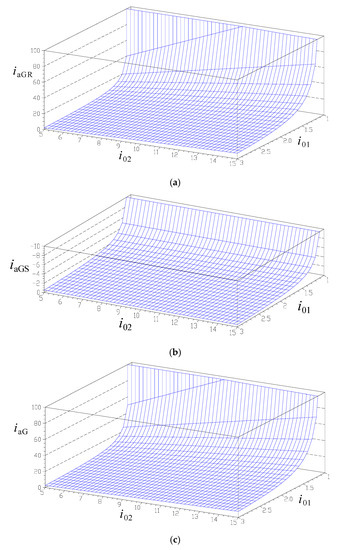 Variations of kinematic ratios (a) iaGR (from R1 to GR), (b) iaGS (from R1 to GS) and (c) iaG (from R1 to G in of counter-rotating electric generator) as functions of the interior kinematic ratios i01 and i02.