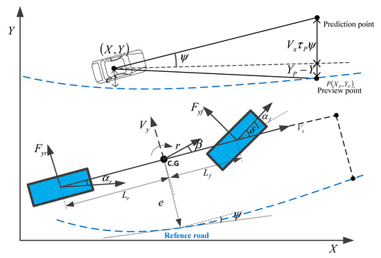 For the sake of designing the path following controller and considering vehicle dynamics, it is supposed that the slip angle and front steering angle of the vehicle are relatively small. Assuming that the vehicle state equation is linear, a two-degree bicycle dynamics model [40] with a linear parameter variation (LPV) is obtained by using the linear proportional relationship between the side angle and lateral tyre force. The path following model of intelligent vehicles is shown in Figure 1.