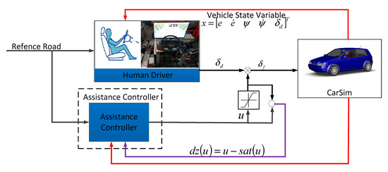 Notably, the above research has mainly focused on the design of assistance controllers that consider control authority and driver characteristics, while less attention is paid to input saturation. Most research has only considered the saturation of the lateral force of the tire [21,22,23,24], and currently, there are only a few good methods to deal with the steering angle saturation [25]. In [25], a robust output feedback controller is presented to adjust the lateral vehicle dynamics under front lateral tire force saturation and a network delay. In [26], a robust yaw moment controller is proposed to improve vehicle stability by considering the uncertainty of the vehicle mass, moment of inertia, cornering stiffness, and control saturation. In [27], the Takagi–Sugeno (T-S) fuzzy method for nonlinear systems under the action of actuator saturation is proposed, and the problem of estimation of the attractive region of the T-S fuzzy system is given by the optimization method. In [28], based on the T-S fuzzy model, a lateral control method is described to address a new driver–automatic collaboration method for the lateral shared control of lane keeping assist systems (LKAS) devices. Under the design conditions based on the least squares method, the input saturation, the driver’s safety, and comfort are clearly considered in the control design. Nevertheless, the lateral control method based on the T-S fuzzy model is proposed to implement control saturation. Moreover, penalizing the objective function so that the physical limits of the actuator are never reached often leads to weak and conservative designs [29]. Model predictive control (MPC) [30,31] is a very effective method for path following with the consideration of the steering angle saturation, but its complexity and less ability to deal with uncertainty are the main shortcomings. Compared with most existing anti-windup schemes, anti-windup [32,33,34,35] compensation schemes are less conservative, but their sizeable computational amount and complexity are the main shortcomings of these algorithm. Therefore, when disturbances and uncertainties are involved in a driver–vehicle system, the input saturation should be clearly considered to prevent performance degradation and the loss of stability [36,37]. Moreover, it is crucial to deal with input saturation by considering a simple computation method.