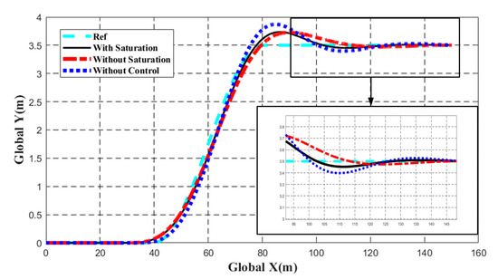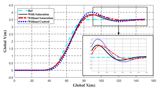 The global trajectories are shown in Figure 7. The driver maneuvers without using the controller have the largest lateral deviations at 90 m and tend to overshoot. The global trajectory position converges at 140 m. Meanwhile, the controller can help the driver quickly reduce the overshoot, and its global trajectories converge at 132 m, which is smaller than the trajectories without the help of the controller. Obviously, the controller can quickly assist the driver in reducing lateral deviations and the overshoot. Compared with both controllers, the controller with consideration of saturation converges faster than the controller without consideration of saturation.