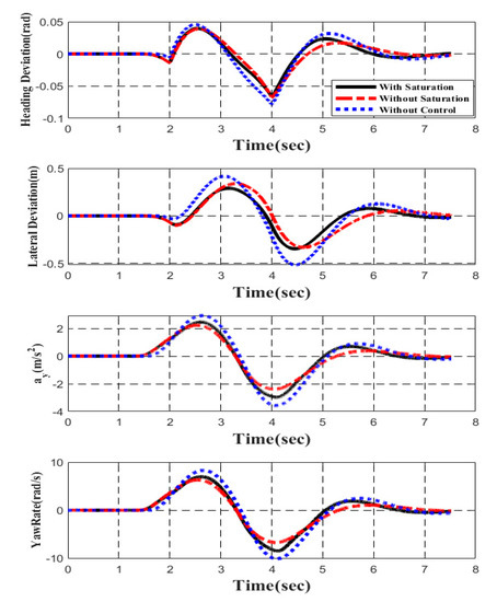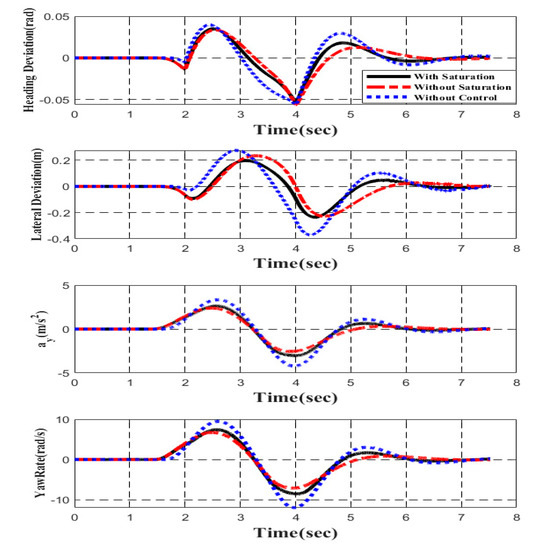 The simulation results for the heading angle deviation, lateral deviation, lateral acceleration, and yaw rate are plotted in Figure 4. The maximum lateral deviation and heading deviation reach 0.23 m and 0.051 rad, respectively, when using the designed controller, which is smaller than that without the controller. Meanwhile, the lateral acceleration and yaw rate responses of the vehicle without the controller have larger amplitudes than the vehicle with the controller. This finding shows that the designed controller assists the driver in obtaining better driving performance. Compared with both controllers, the controller with a consideration of saturation has a small lateral deviation. The lateral acceleration and yaw rate with a consideration of saturation have slightly larger amplitudes than those without considering saturation. This result shows that the controller with a consideration of saturation can optimize the driving performance by limiting the input.