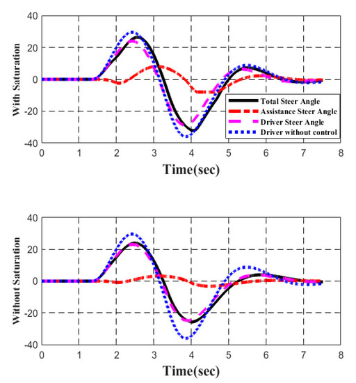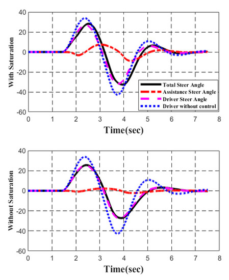 The simulation results for the driver steering angle are plotted in Figure 6. It is clear that drivers without assistance control require more aggressive steering control angles to smoothly track the trajectory. The steering angle without using the controller is up to 44° at 3.8 s, and the driver suffers from driver overload. According to Table 1, the assistance controller provides a small assistance steering angle to assist the driver and can reduce the driver’s workload. Moreover, the controller with the consideration of saturation can optimize driving performance and improve the state convergence rate by limiting the input.