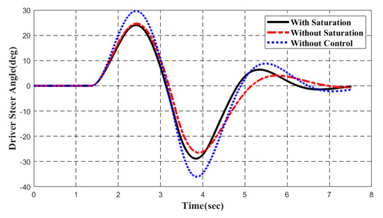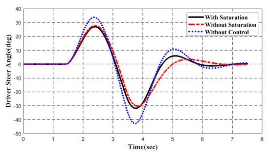 The simulation results for the driver steer angle are shown in Figure 10. It is clear that the driver without a controller requires more aggressive steering control angles to smoothly track the given trajectory, which may lead to a large deviation. The steering angle without using the controller reaches 39° at 3.8 s and tends to overshoot. The driver steering angle using the designed controller can be maintained within a specific range of approximately 30°. According to Table 2, the assistance controller can reduce the driver’s workload by providing a small assistance steering angle to assist the driver.
