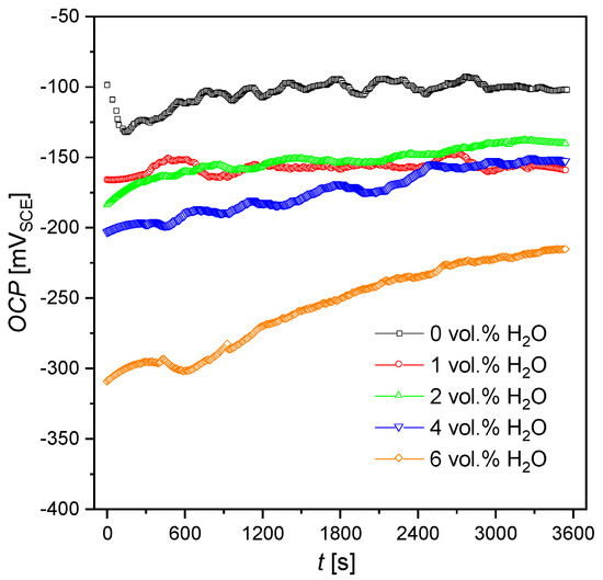 The dependence of the open-circuit potential in the function of time (t) measured for AISI 1010 steel immersed in sulfolane containing up to 6 vol.% of water is illustrated in Figure 1. It is noticeable that the average value of the OCP decreases with the increasing water concentration in sulfolane. In particular, when the water concentration increases from 0 to 6 vol.%, the average value of the OCP decreases from –104(1) to –257(2) mVSCE. The decrement of the OCP indicates an increment in the thermodynamic tendency to the corrosion of AISI 1010 steel. It should be noted that for water content ranging from 1 to 4 vol.%, the OCP values are comparable, although at the same time, the OCP values are lower by ca. 60 mVSCE compared to the water-free sulfolane. As a relative measure of OCP dispersion, a coefficient of variation (specified as the ratio of the standard deviation to the OCP average) was determined. It was recorded that for the last 20 min of the OCP measurement, the coefficient of variation did not exceed 3% for all the investigated electrodes (see Figure 1). Thus, one can state that AISI 1010 steel electrodes achieved a stable value of open-circuit potential in sulfolane solution that is necessary to record potentiodynamic curves properly.