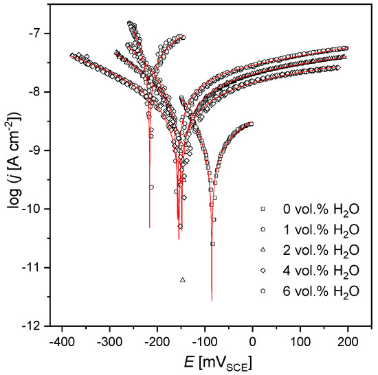 Potentiodynamic polarization curves for the AISI 1010 steel electrodes immersed in sulfolane containing up to 6 vol.% of water; symbols and solid lines represent experimental data and fit of Equation (1), respectively; VSCE is the electrode potential measured vs. saturated calomel electrode.