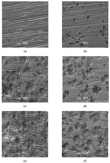 In addition to the electrochemical parameters, images of the corroded material surface are one of the most significant sources of corrosion data. Briefly speaking, the images qualitatively/quantitatively describe the shape, area and distribution of corrosion damage. Figure 3 presents the SEM images of the AISI 1010 steel surface after a corrosion test without etching of the corrosion products layer. It can be illustrated qualitatively that the nature of corrosion damage of AISI 1010 steel depends on the water concentration in sulfolane. Larger pits are visible for the steel electrode immersed in water-containing sulfolane compared to steel electrode immersed in water-free (pure) sulfolane. The observed changes on the material surface can be explained by the increased corrosivity of the environment towards AISI 1010 steel which is caused by the presence of sulphurous acid formed in the reaction of sulfolane with water and air [24,25,26].