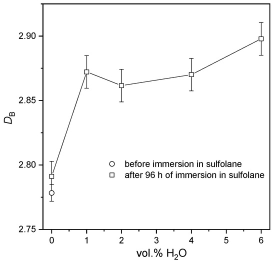 In order to quantify local changes on the corroded steel surface, the fractal dimension (DB) was determined using 2D grayscale images. Generally, the values of fractal dimension can vary in the range of 2 to 3—for a smooth surface, DB is equal to 2, while for a more rough and irregular one, it is closer to 3. Concerning the corrosion resistance of materials, one can state that the more serious the corrosion damage, the larger the fractal dimension is. The lowest fractal dimension corresponds to the AISI 1010 steel electrode in the initial state as depicted in Figure 4. In fact, the fractal dimension does not change significantly for the water concentration in sulfolane in the range of 1 to 4 vol.%. It means that the protective layer formed on the steel surface is stable in the above range of water concentration. On the other hand, the extension of the water concentration up 4 vol.% caused the increment of DB again (see Figure 4). One can state that when the corrosion products layer is dissolved, the surface of the steel electrode becomes rougher. Moreover, the fractal dimension corresponds to the corrosion rate for the tested steel.