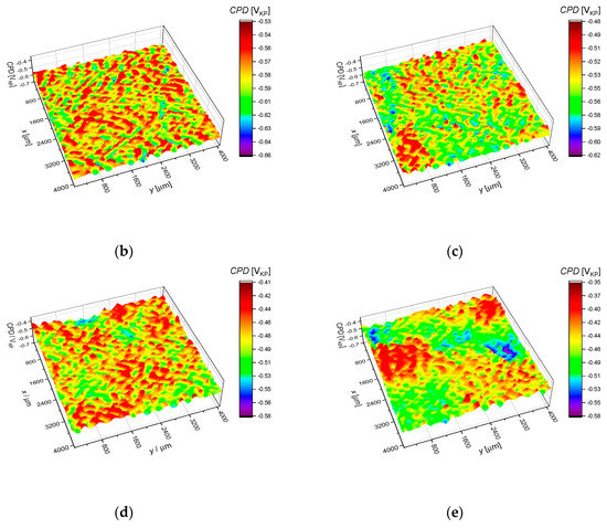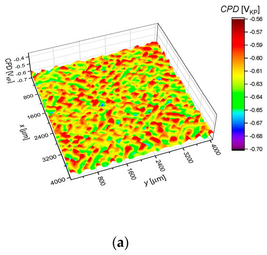 where μk is called the k-th central moment and k = 2, 3 and 4. Skewness and kurtosis describe the shape of the contact potential difference distribution being useful for indicating the presence of surface heterogeneities. Skewness describes the degree of symmetry of the CPD distribution about the average value. The sign of CPDsk indicates the predominance of CPD peaks (CPDsk > 0) or valleys (CPDsk < 0), while kurtosis specifies the presence of extremely high peaks/deep valleys (CPDku > 0), respectively. Surfaces with a texture, i.e., those for which one can distinguish the privileged direction, will tend to have CPDku < 0.
