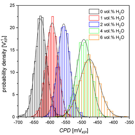 Histograms of contact potential difference (CPD) determined using maps shown in Figure 5; solid lines—fit of the Gaussian distribution (see Equation (7)); VKP is the voltage measured versus Kelvin probe.