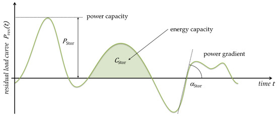 Storage consisting of packets of Li-ion cells can reach a capacity of several megawatts, which allows them to be used to control the system operation composed of renewable sources and allows the parameters (voltage, frequency, active power and reactive power) of this system to be controlled. As with other types of energy storage, these systems should be optimally sized in terms of power and energy capacity by using the input characteristics and residual load curve, i.e., considering both energy demand and generation from “must-run” conventional units, as shown in Figure 1.