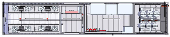 Analysis of the developed practical application, assuming a reduction of electricity purchase costs, was carried out based on the measurements and considering the 1 MW BES with a total capacity of 478 kWh. The construction of the battery container is shown in Figure 2. The storage system consists of three compartments responsible for energy storage, process controls, and connection with the power grid. The energy storage is composed of a set of 5040 lithium-ion cells connected in eight parallel series, which are located in an air-conditioned compartment with a constant ambient temperature. The control of processes occurring during battery operation is connected with the monitoring system and transformers, fire protection, supervision, and a communication system. Two transformers on two voltage levels could realize the power flow between the energy storage and the power grid: low voltage (0.3/0.4 kV) and medium voltage (0.3/10 kV). The electrical energy storage also has two 500 kW inverters with common regulation.
