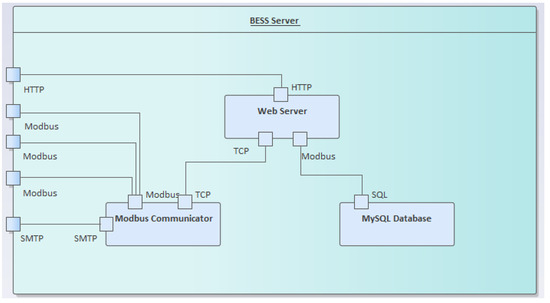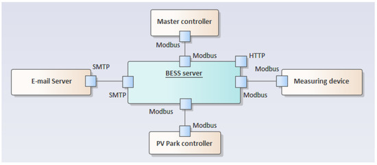 An important element of the BES system is a server which consists of three blocks representing a given component. The communication architecture is shown in Figure 4. The server’s tasks include the reading of data measured from the master controller and from six power quality analyzers. In addition, the server collects information about electricity generation from a PV farm. The information is retrieved by the Modbus communication server element and then stored in the MySQL database. The Web Server component provides the ability to display the current values measured and historical data via a network interface. It is also possible to control the operation of the entire BES remotely using this system.