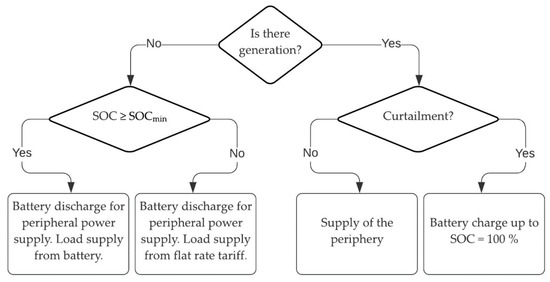 The control system must work with a specific algorithm to implement the adopted model. The algorithm should consider the operating model of the PV farm and the current SOC level of the battery. Depending on the mode in which the PV farm is operating, the algorithm switches the BES accordingly. The scheme of the algorithm is shown in Figure 6.