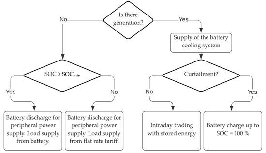 In the first variant, energy generation from a solar farm is limited due to network conditions (network overloads). If the supply grid is not able to absorb the full generation due to other load flows, the PV park generation is limited to . The difference between the maximum power and the power resulting from the limitation could be used for charging the BES process, HVAC systems, and covering the PV farm’s own demand. The reserve capacity is calculated for each day since the cooling system’s power demand must be covered until the beginning of the next day’s generation period. This is based on the period between the end of the generation period of the current day and the beginning of the generation period of the following day. This results in the reserve capacity required (average 90 kWh) and a corresponding minimum state-of-charge () for each day of the year. The control algorithms ensure that the battery is not discharged below the calculated reserve SOC. Additionally, if the amount of energy generated is not enough to charge the BES to a specific SOC value, the battery is recharged in the evening when production is limited (weather conditions) and the network demand for energy is small. During the night, the stored energy is used to sustain the power supply for the monitoring, control, and protection systems of the PV farm. The procedure of model operation is presented in Figure 5.