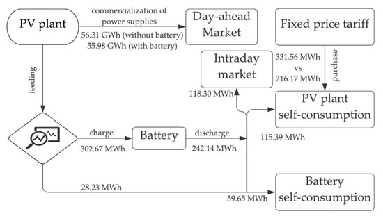 The parameters necessary to perform the relevant calculations were adopted to make an economic analysis of the solution. These parameters are presented in Table 3. Based on the scenario results, a diagram of energy distribution was created between network elements, which is presented in Figure 7.