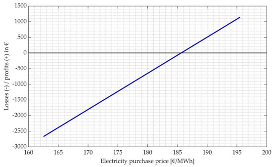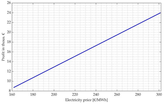 Based on the simulation, the potential profit was calculated depending on the electricity prices. The calculations include fluctuations and changes in energy prices over time. The scope of price changes was adopted in accordance with Figure 11. The costs and profits were presented in Table 6 based on the accepted energy price of 161.5 €/MWh, similar to the case in Section 4.1.
