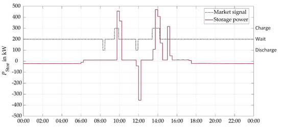In the second case, the BES for system applications, such as the regulation for power losses, is used during the time of the day according to the price of energy on the market. Time windows depend on weather conditions, and therefore, the time window is limited in winter due to shorter production time. The decision about charging or discharging the energy storage is made based on the signal received via the network interface. The signal is sent to the BES system and can take three states: “charging”, “discharging”, and “waiting.” Figure 12 presents the curve of the signal controlling operation of the 1 MW battery for study case B. The three states can be observed as follows: At 8:15, the control signal changes the status to “wait” and then goes into the status “discharging”. During this time, the battery has been already discharged such that the “discharging” command cannot be carried out (night discharge). Another control signal is “charge” in response to the current battery SOC. Appropriately, the discharge command is repeated between 11:45 and 12:00 and carried out as a result of the previous charging. A slight displacement of the control signal and BES system response can be seen in Figure 12. This is caused by different data resolutions—the control signal is registered in 1 min intervals and the Janitza analyzers record values at 15-min intervals.