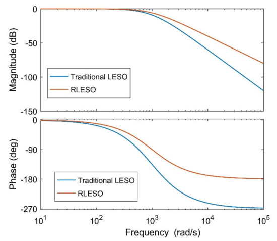 Figure 7 shows the comparison of the traditional LESO and RLESO disturbance observation capabilities. Compared with traditional LESO, the bandwidth of RLESO is increased, and the disturbance observation ability of LESO is improved. At the same time, the phase lag of RLESO is reduced. However, the attenuation degree of its high-frequency band is reduced, which makes LESO vulnerable to high-frequency noise.