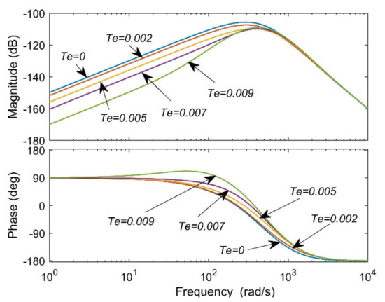 Figure 11 shows the frequency domain characteristic curve of the disturbance term. Compared with LADRC based on RLESO, the gain of the system in the middle and low frequencies is reduced after adding the correction link, and the anti-disturbance performance of the improved LADRC in the middle- and low-frequency band is enhanced. At the same time, with the increase of Te, the anti-interference performance of the system is gradually enhanced, and the degree of phase lag is gradually reduced.