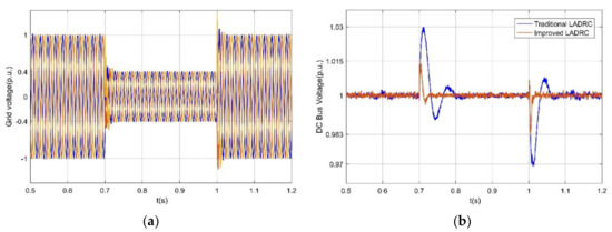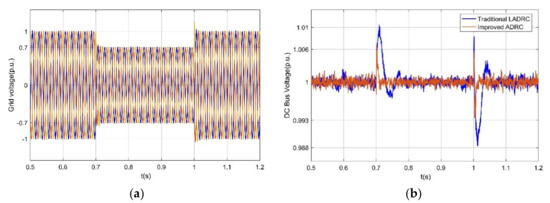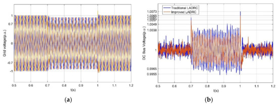 Figure 15 shows the power network voltage waveform and DC link voltage waveform when the power network voltage drops by 0.6 p.u. symmetrically. When it is set at 0.7 s, the grid voltage will fall symmetrically and return to normal after 0.3 s. At the moment of fault, the overshoot of the DC link voltage controlled by the conventional LADRC is about 0.03 p.u., and that of the improved LADRC is close to 0.015 p.u.; at the moment of fault recovery, the drop amplitude of the DC link voltage controlled by the conventional LADRC is about 0.03 p.u., and that of the improved LADRC is close to 0.017 p.u.
