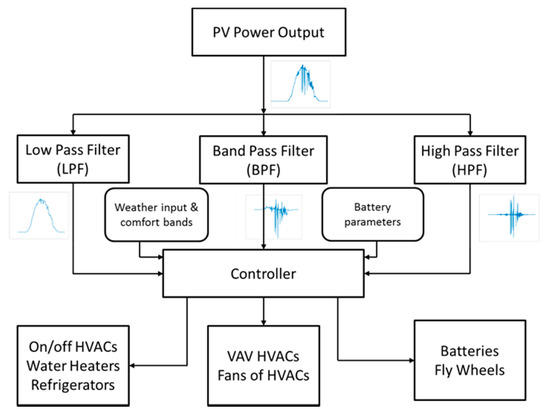 On the other hand, this paper focuses on utilizing building TCLs, such as HVAC systems, water heaters (WHs), and refrigeration systems, to act as virtual batteries and consume most of the PV generation locally in order to minimize its impact on the grid (minimizing voltage fluctuations and two-way power flows) without compromising the occupants’ comfort. This contrasts most of the previous works that mainly focused on offsetting the fast variations in the solar PV power (or frequency transients). The opportunity of consuming most of the PV power output by local building TCLs is explored. Spectral (frequency) analyses are first conducted for one-year time duration of solar PV power output and various building TCLs power consumption measurements to better understand their frequency contents. These analyses identify the spectral contents of PV generation that can be consumed by the different types of building TCLs for optimal building load utilization. Then, an intelligent control strategy is used to allow the building TCLs to consume most of the solar PV generation while satisfying the occupants’ comfort and TCLs’ hardware constraints. We adopt an MPC-based optimal control strategy to dispatch multiple building TCLs such that the aggregate power consumption of all TCLs closely tracks the low and medium frequency content of the solar PV generation. We also show that the remaining high-frequency content of the solar PV power output can be offset using batteries/fly wheels. The main contributions of this work are summarized as follows: (1) conducting spectral analyses of one-year worth of solar PV power data together with the power consumption of multiple building TCLs to better understand their frequency contents and, therefore, optimally assign the building TCLs to the appropriate frequency content of PV power, and (2) verifying through simulations that most of the low and medium frequency content of the solar PV power can be consumed locally by building TCLs using an intelligent control strategy, while the remaining high-frequency content can be offset using electrical batteries/fly wheels.