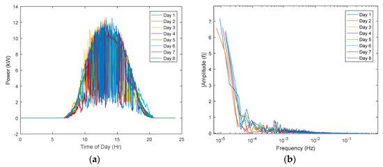 (a) Time-domain solar PV power profiles for eight summer days, and (b) their corresponding frequency-domain power profiles.