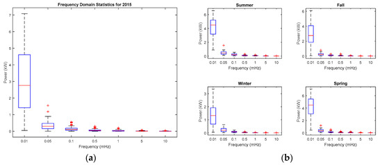 Boxplots [29] are used to visualize the annual and seasonal statistics of PV frequency content. The lower and upper lines of the “box” represent the 25th and 75th percentiles of the sample, respectively, the line in the middle of the box is the sample median, and the extended lines from each end of the box represent the minimum and the maximum values in the sample. Figure 3a illustrates the annual statistics of the PV power output frequency content. It is observed that about 98% of the PV energy is located in the low frequency band (lower than 1 mHz (~15 min)). Additionally, only little PV energy (about 2%) is found at frequencies between 1 and 100 mHz (~15 min to 10 s). Finally, PV energy at frequencies higher than 100 mHz is almost negligible (not shown in Figure 3a). The low frequency content corresponds to the daily solar power variations, which are mainly from the parabola shape in the time-domain power profiles. The medium frequency content comes from changes in solar irradiance due to moving clouds and other factors, while the high-frequency content comes from changes due to passing flocks of birds, local intermittent shading, etc. Furthermore, it can be observed that the dispersion from the medians is quite large, especially at low frequencies (~3 kW at 0.01 mHz, ~0.3 kW at 0.05 mHz, etc.) due to many factors that include daily/hourly variations, diffuse/beam solar irradiance, and other factors. Figure 3b illustrates the seasonal statistics of the PV power output frequency content. It is observed that the median powers are highest in summer, moderate in fall and spring, and lowest in winter at the selected location.