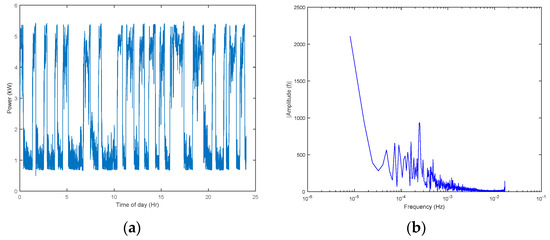 (a) The collected 24-h water heater power consumption for one summer day, and (b) its corresponding frequency-domain power profile.